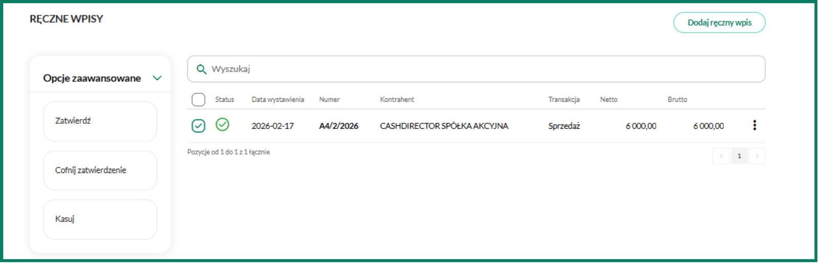 Aby skorzystać z funkcji Ręczne wpisy, najpierw wprowadź kontrahenta do Systemu.