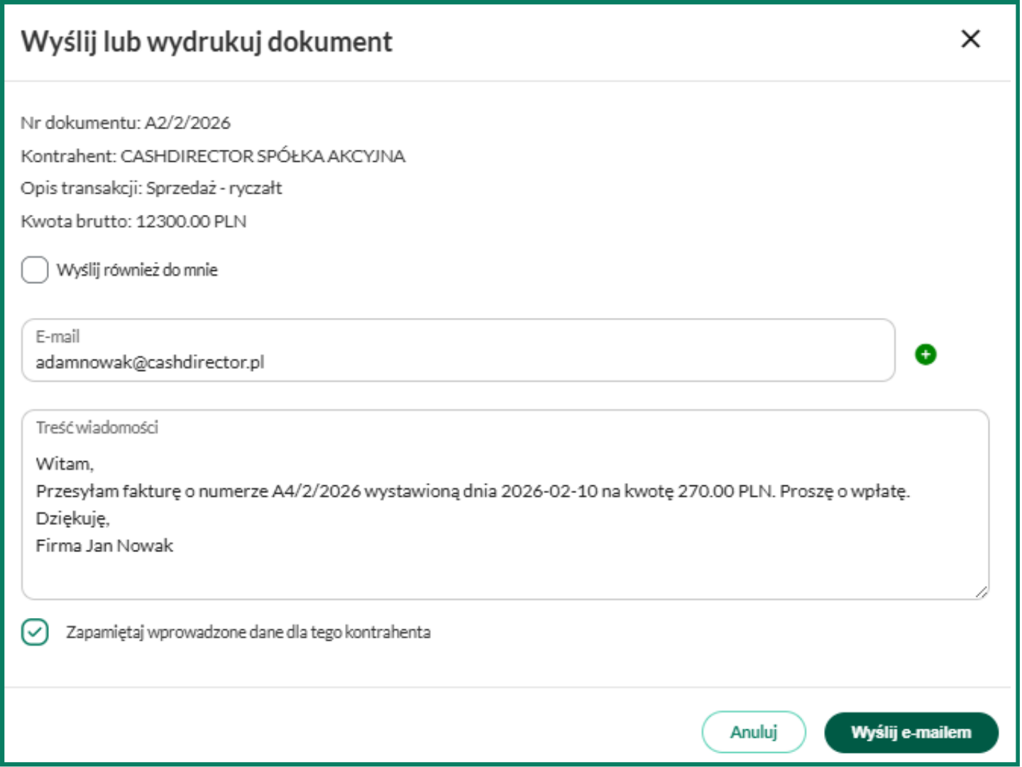 - uzupełnij adresy mailowe kontrahentów we wskazanym polu e-mail (aby dodać kolejny adres wybierz ikonę plusa),