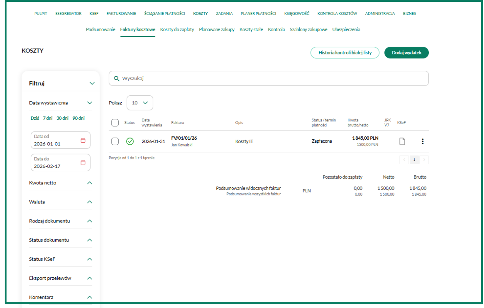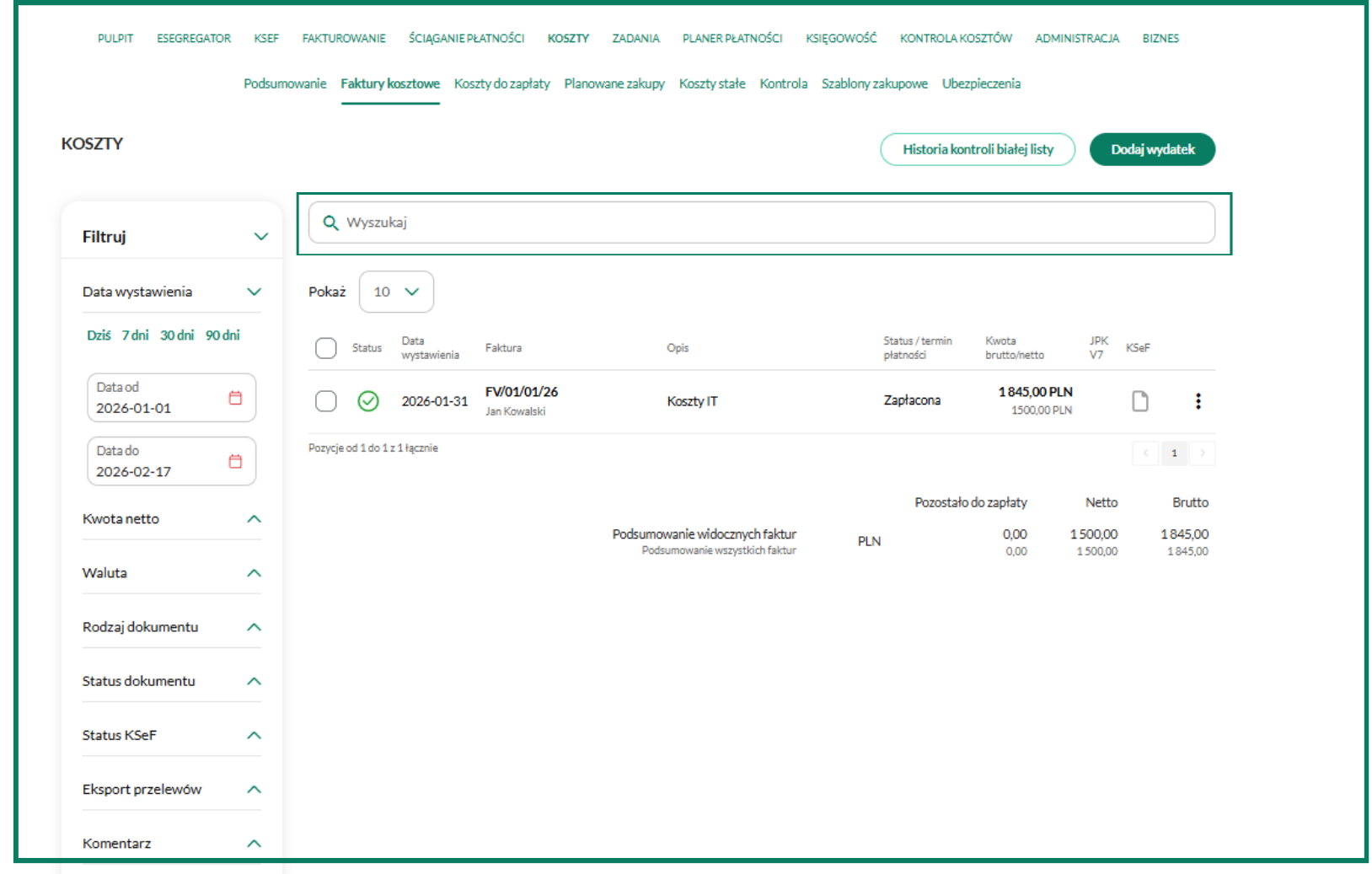 Wszystkie faktury kosztowe, które zostały wprowadzone, znajdziesz w zakładkach Koszty/Faktury kosztowe lub Księgowość/Faktury kosztowe.