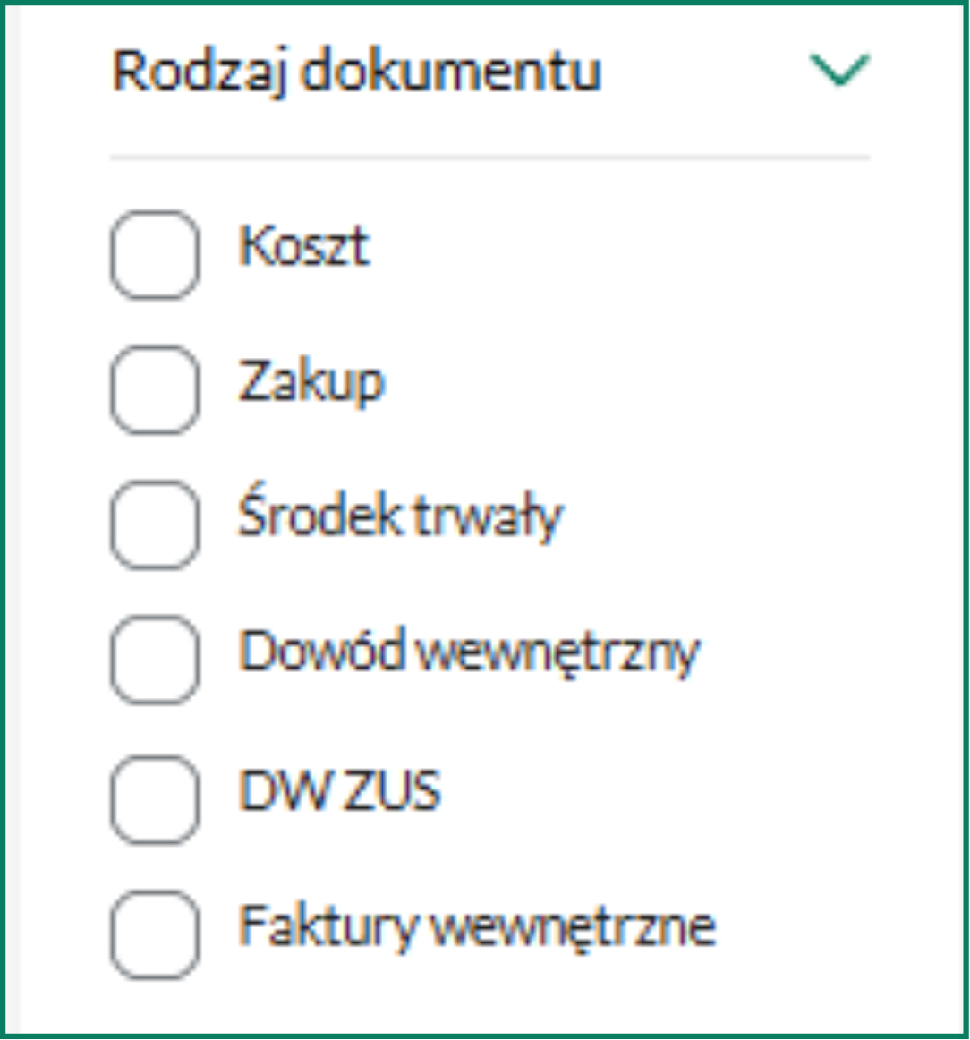 rodzaj dokumentu – pozwala wybrać koszt, zakup, środek trwały, dowód wewnętrzny, DW ZUS lub fakturę wewnętrzną,