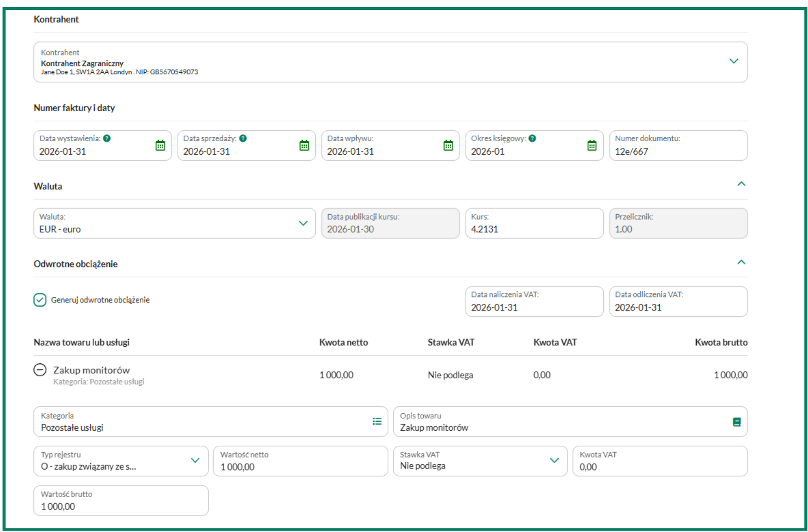 Aby uwzględnić prawidłowe wartości w rejestrze VAT podczas uzupełniania szablonu faktury zakupu, możesz skorzystać z parametru Generuj odwrotne obciążenie. Opcja ta pojawi się automatycznie, gdy w danych adresowych kontrahenta ustawisz kraj inny niż Polska.