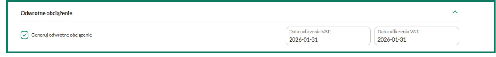 Zaznaczenie parametru Generuj odwrotne obciążenie spowoduje wyświetlenie dwóch dodatkowych pól: Data naliczenia VAT oraz Data odliczenia VAT. W tych polach wskaż miesiąc, w którym podatek VAT ma zostać ujęty w naliczeniu i odliczeniu.