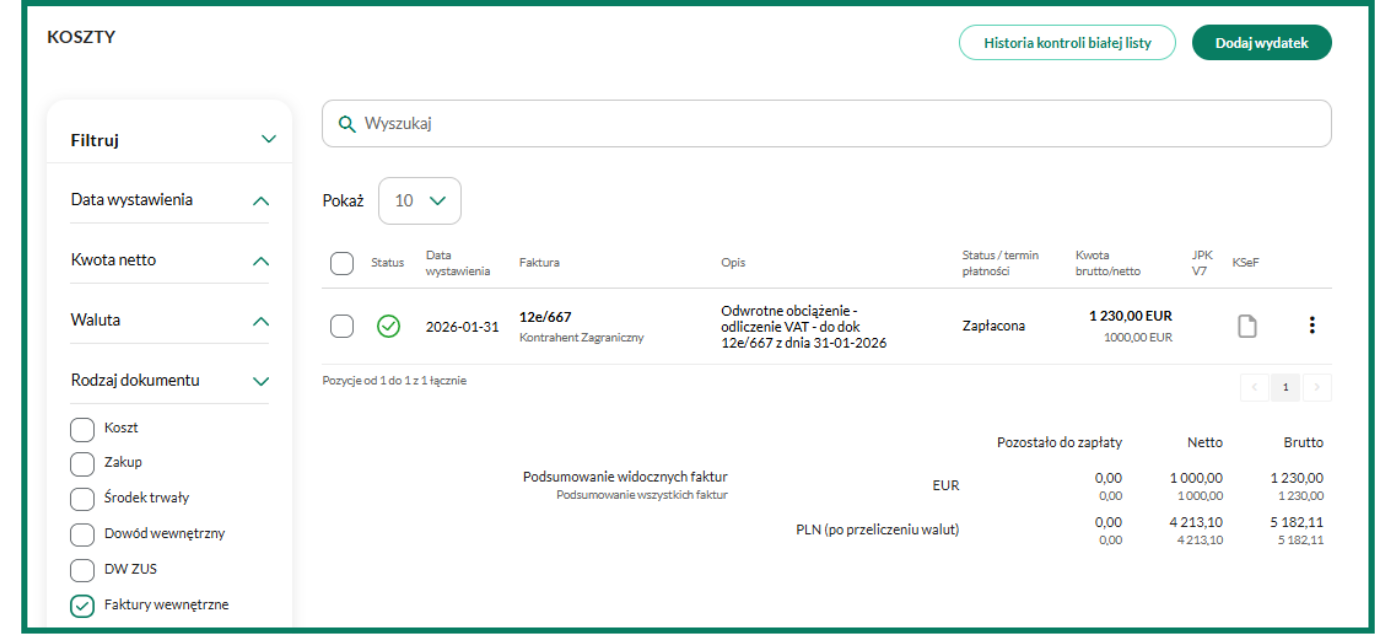 • faktura na odliczenie VAT zostanie wygenerowana w zakładce Koszty/Faktury kosztowe.