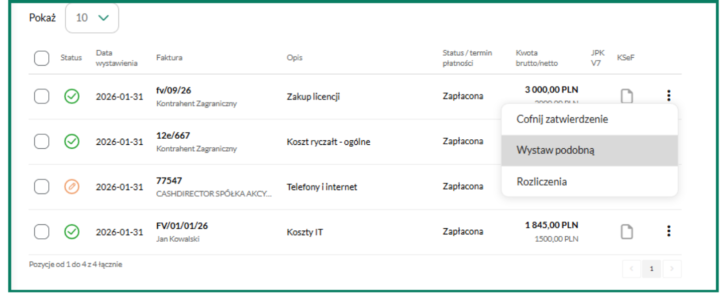 Zaksięgowanie faktury kosztowej od tego samego kontrahenta możesz usprawnić, korzystając z funkcji Wystaw podobną.