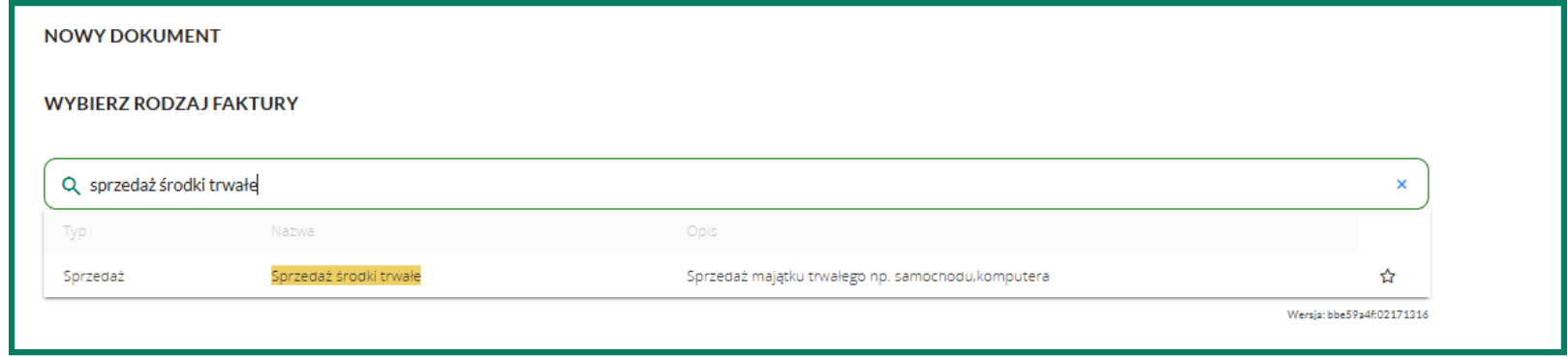 Fakturę dotyczącą sprzedaży środka trwałego wprowadź w zakładce Fakturowanie/Faktury, klikając przycisk Wystaw z szablonu, a następnie wybierz szablon Sprzedaż – Środki trwałe.