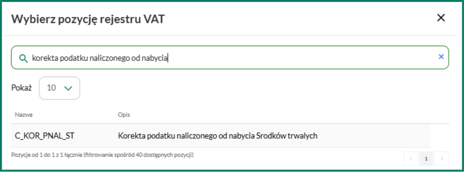 7. Kliknij w polu Słownik i wybierz parametr Korekta podatku naliczonego od nabycia ST (poz. 44 JPK).