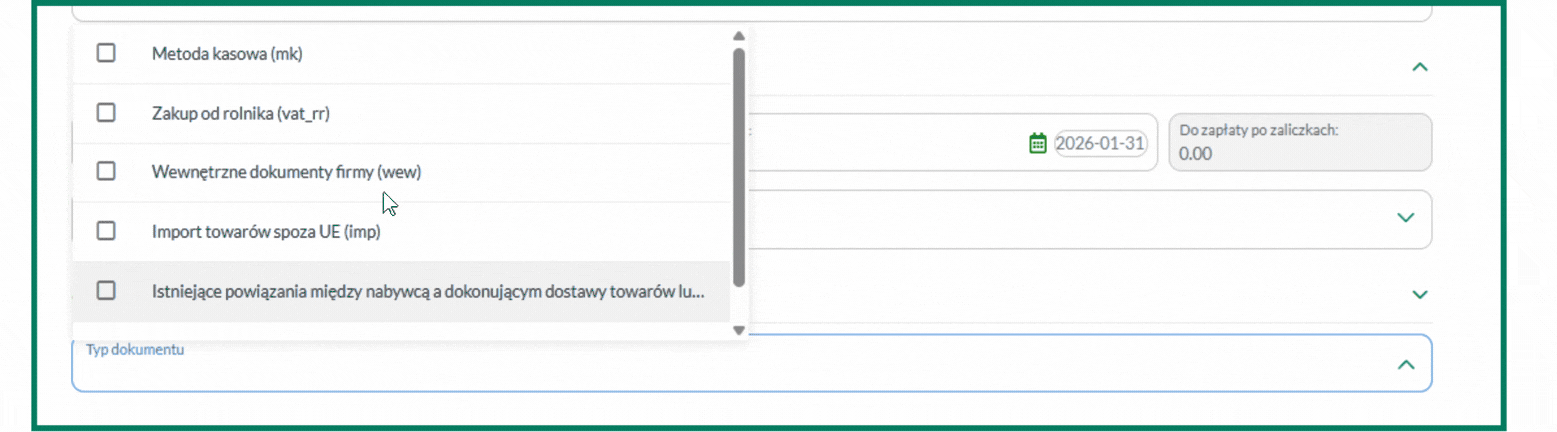 8. Jako typ dokumentu wybierz Wewnętrzne dokumenty firmy (wew).