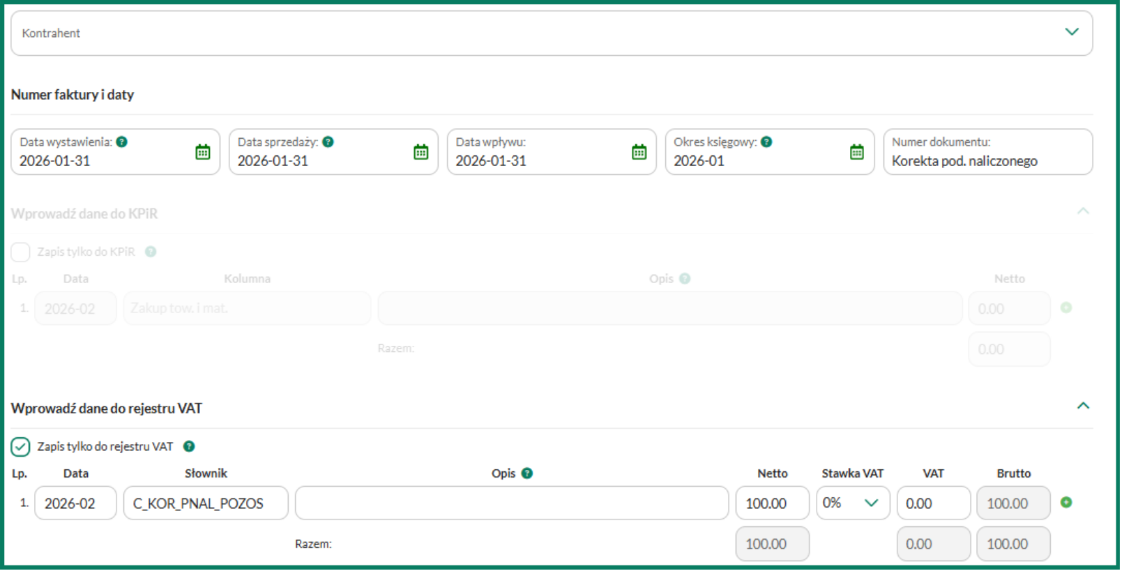 6. Wybierz Zapis tylko do rejestru VAT. W polu Data wskaż miesiąc, w którym korekta podatku naliczonego powinna zostać uwzględniona.
