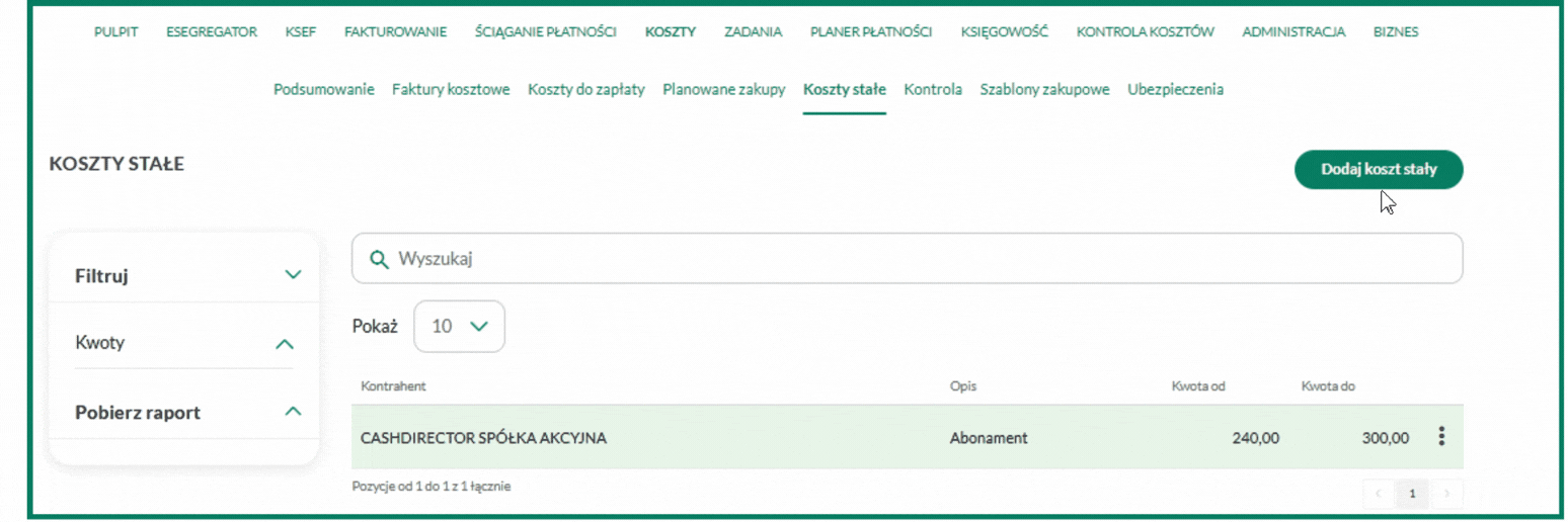Jeśli posiadasz faktury kosztowe o tej samej lub zbliżonej kwocie (np. za telefon czy Internet), możesz w Systemie utworzyć koszt stały. Funkcjonalność ta pozwala sprawdzić, czy wszystkie faktury dotyczące kosztów stałych zostały zaksięgowane w danym miesiącu