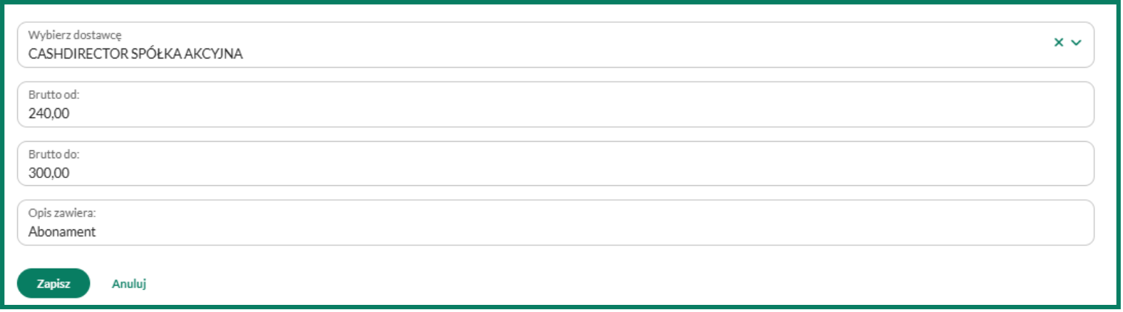 Wybierz kontrahenta, wprowadź zakres kwot brutto oraz opis. Po dokonaniu zmian, kliknij przycisk Zapisz.