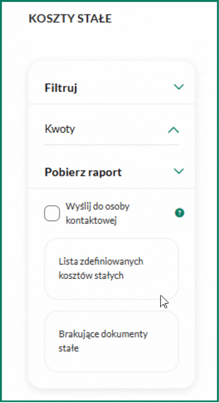 Możesz wygenerować dokument zawierający wszystkie aktualnie wprowadzone koszty stałe w Systemie. W tym celu przejdź do zakładki Koszty/Koszty stałe, rozwiń listę Pobierz raport i wybierz opcję Lista zdefiniowanych kosztów stałych. System wygeneruje dokument z zapisanymi kosztami stałymi.