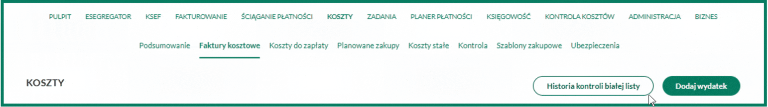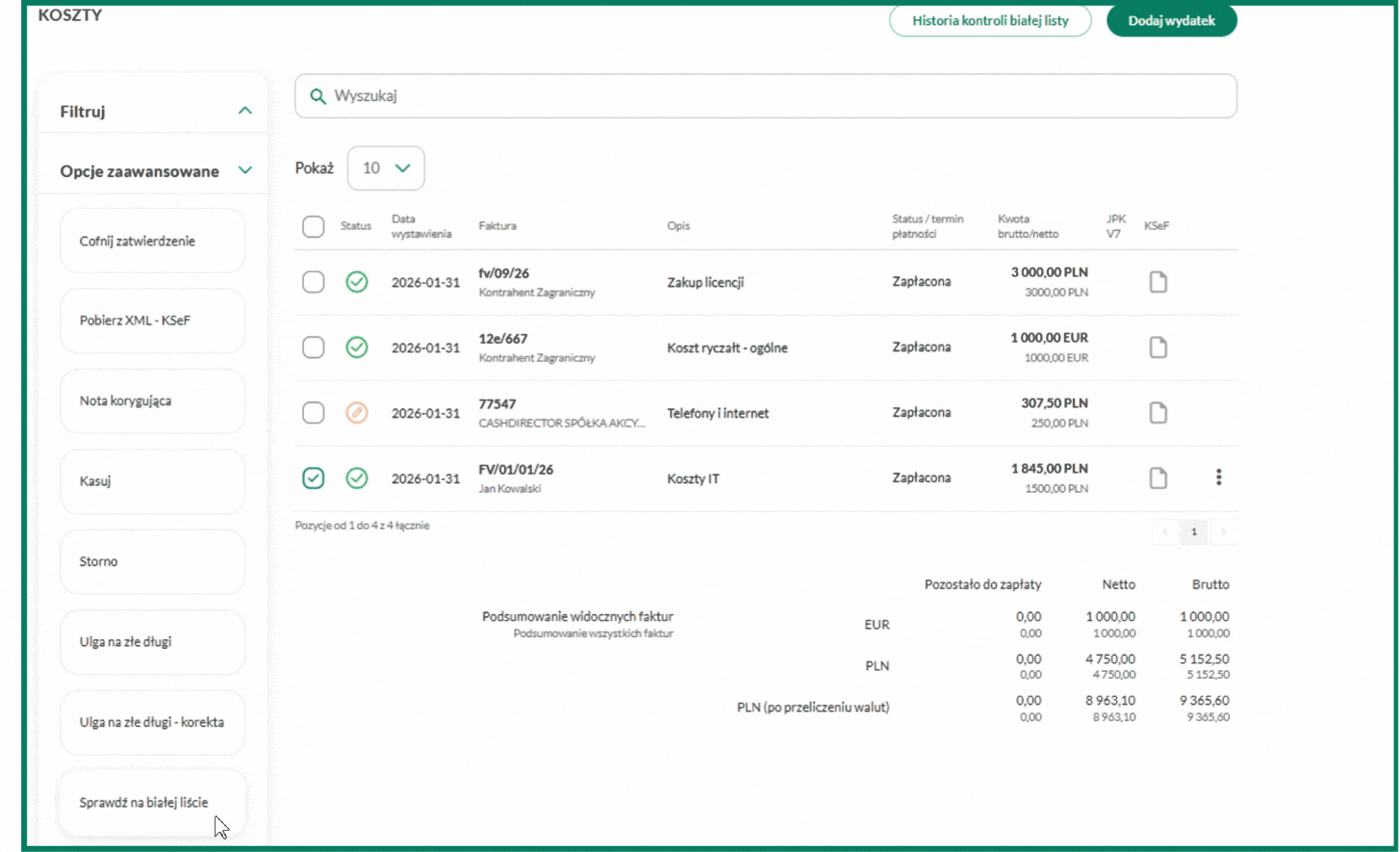 Aby to zrobić, przejdź do zakładki Koszty/Faktury kosztowe i zaznacz fakturę. Następnie wybierz z panelu Opcje zaawansowane/Sprawdź na białej liście.