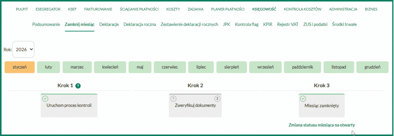 W przypadku, gdy musisz zaksięgować fakturę w miesiącu już zamkniętym, otwórz ten miesiąc w zakładce Księgowość/Zamknij miesiąc. Skieruj kursor na odpowiedni okres i wybierz funkcję Zmiana statusu miesiąca na otwarty: