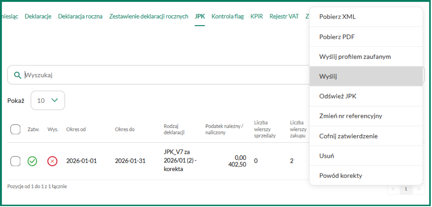 Po wyświetleniu komunikatu sprawdź status wysyłki pierwotnego pliku JPK_V7. Jeśli został przyjęty i wymaga zmian, wyślij korektę. W przeciwnym razie możesz usunąć korektę i przesłać zaktualizowany plik jako wersję pierwotną.