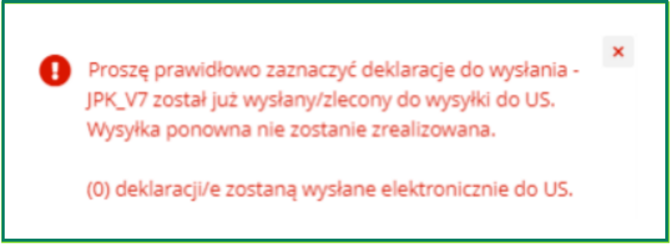 Jeśli spróbujesz ponownie wysłać ten sam plik JPK, który znajduje się już w jednym z poniższych statusów, wysyłka nie zostanie zrealizowana. Zamiast tego wyświetli się komunikat informujący o braku możliwości ponownej wysyłki: