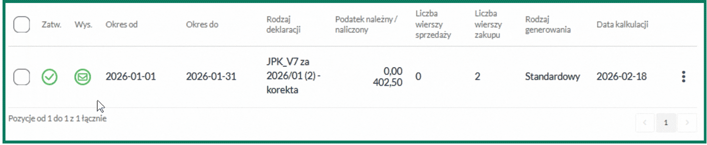 Po przejściu do zakładki Księgowość/JPK wyświetli się niezatwierdzony plik JPK_V7. W momencie jego zatwierdzenia System automatycznie zatwierdzi również poglądową deklarację VAT, którą znajdziesz w zakładce Księgowość/Deklaracje.
