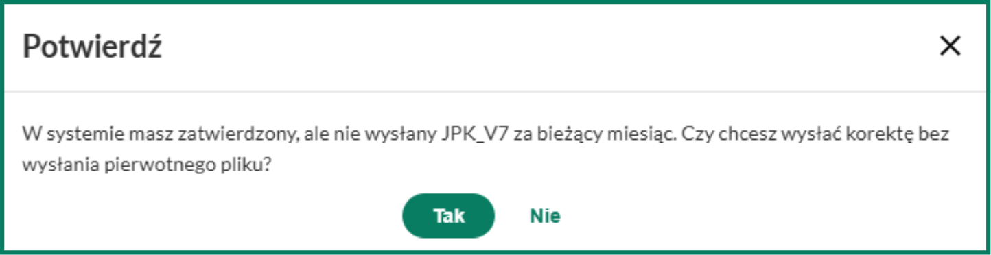 Podczas próby wysyłki korekty pliku JPK_V7 wyświetli się komunikat o konieczności zweryfikowania wysyłki dokumentu pierwotnego, jeżeli pierwotny JPK_V7 nie będzie wysłany: