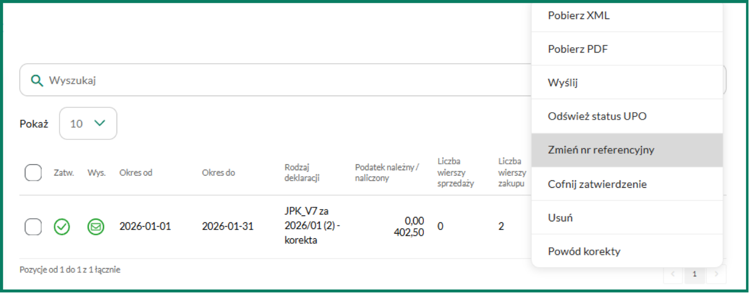 W celu sprawdzenia statusu wprowadź numer referencyjny pobrany z systemu z zakładki Księgowość/JPK, skieruj kursor na trzy kropki z prawej strony pliku JPK_V7 i kliknij przycisk Zmień numer referencyjny.