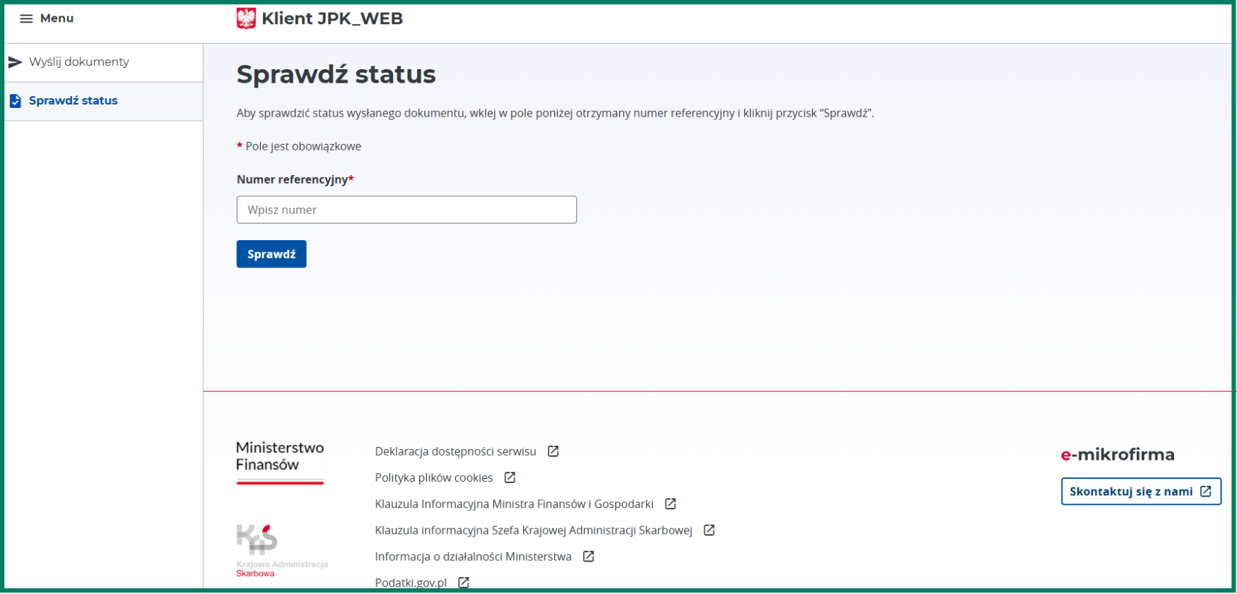 Status wysyłki pliku JPK można zweryfikować na stornie e-mikrofirma.mf.gov.pl.
