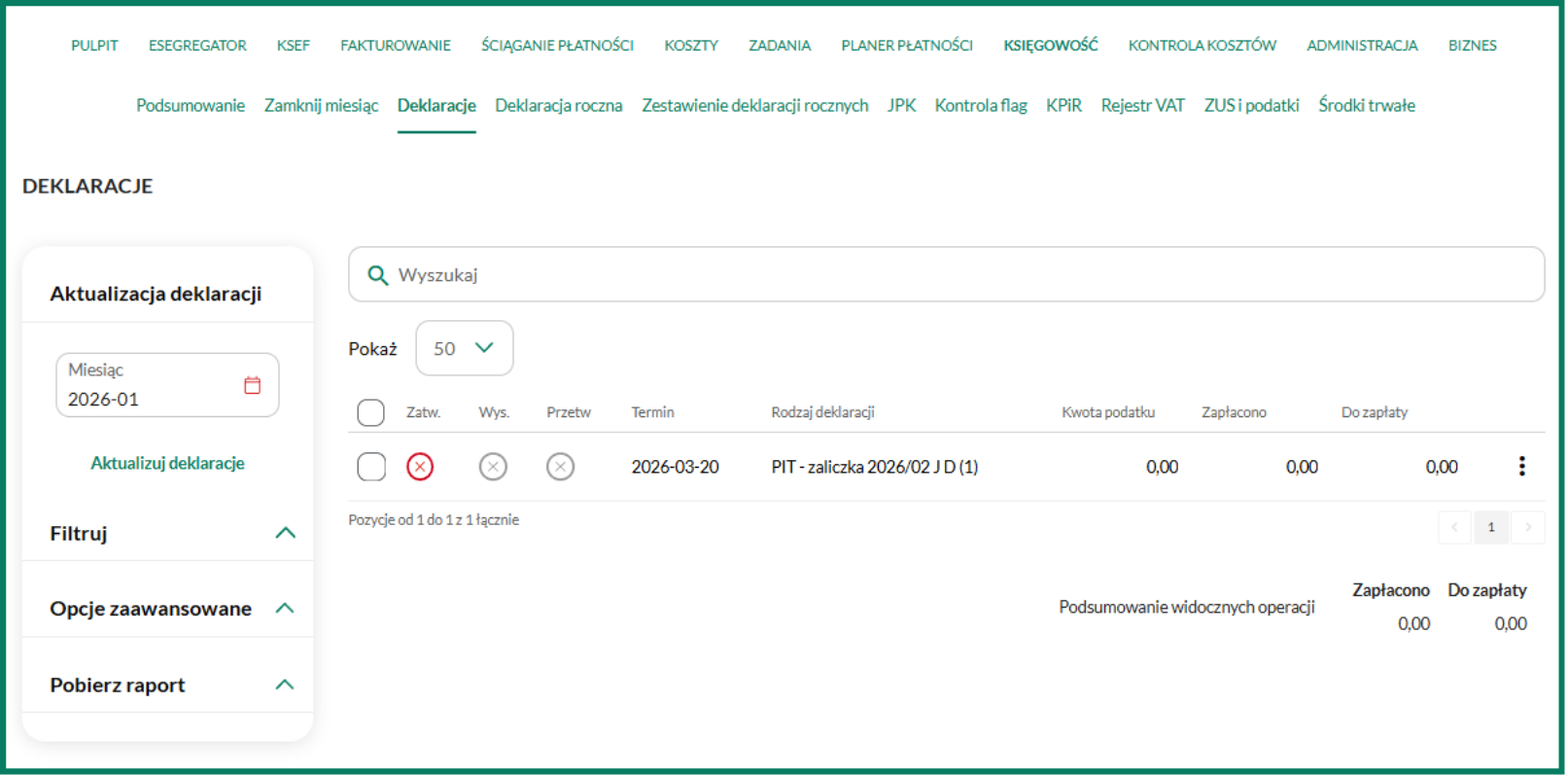 Aby zweryfikować wygenerowaną zaliczkę przejdź do zakładki Księgowość/Deklaracje. Na wygenerowanej zaliczce możesz wykonać następujące opcje: Rozliczenia, Zatwierdź, Drukuj, Komentarze oraz Podgląd dokumentu.