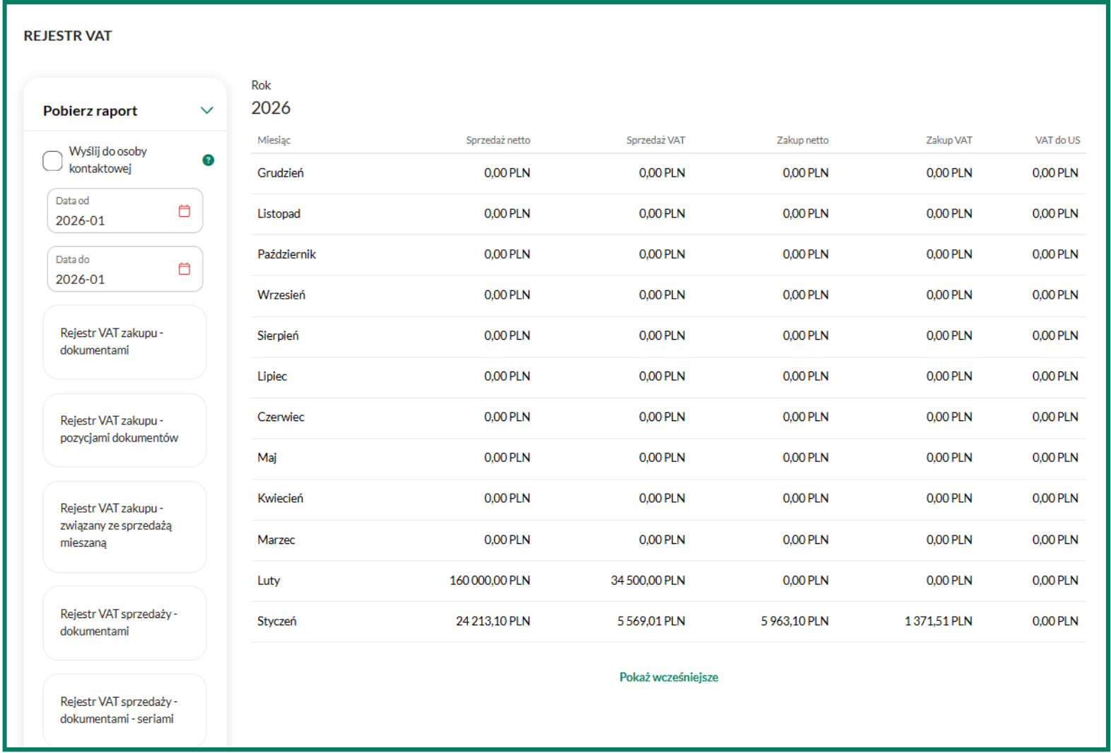 W tym celu, po lewej stronie ekranu wybierz miesiąc lub kwartał, dla którego chcesz pobrać zestawienie. Następnie kliknij w odpowiedni szablon raportu – np. Rejestr VAT zakupu – dokumentami.