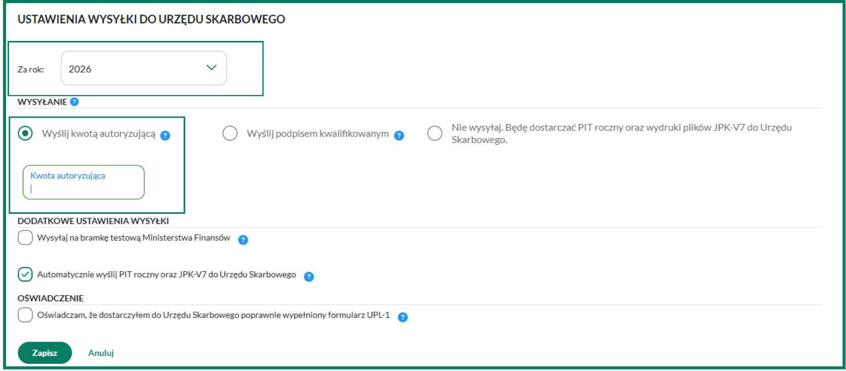 2. Zaznacz parametr Wyślij kwotą autoryzującą, natomiast w polu Kwota autoryzująca uzupełnij kwotę przychodu z zeznania rocznego.