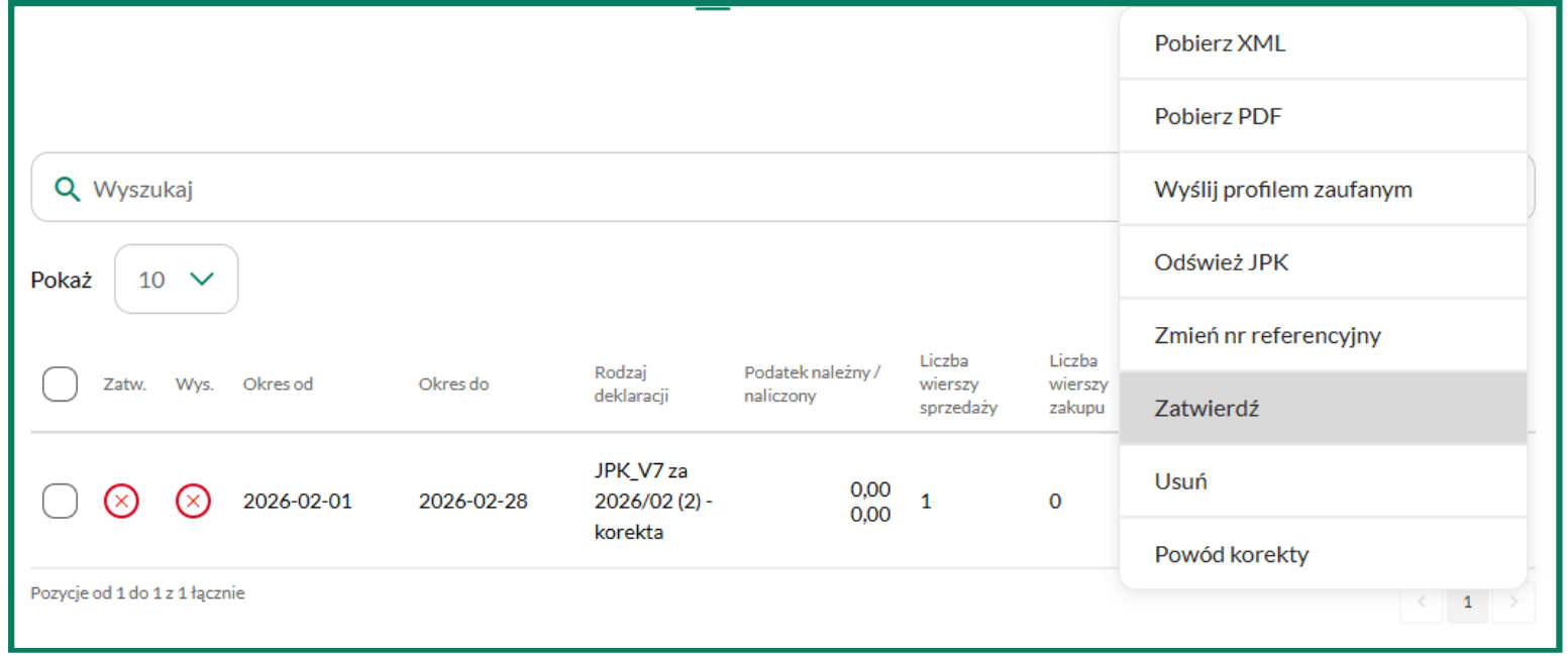 Przed wysłaniem pliku JPK konieczne jest jego wcześniejsze zatwierdzenie. Aby to zrobić, skieruj kursor myszy na dokument i wybierz opcję Zatwierdź.
