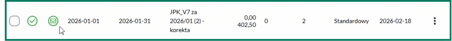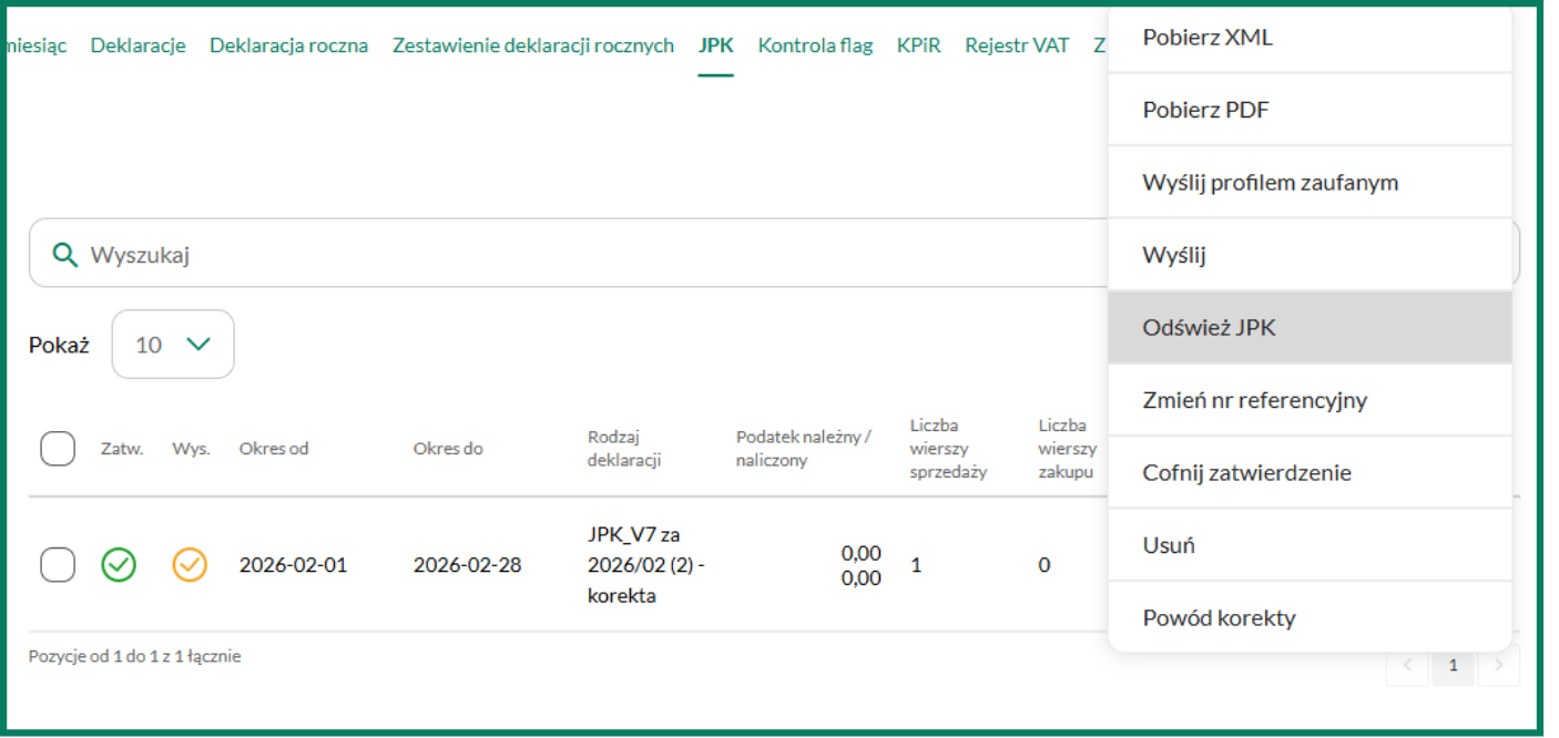 Funkcja Odśwież JPK służy do aktualizacji statusu wysyłki pliku JPK do Urzędu Skarbowego. Jeśli po przesłaniu deklaracji żółta ikona nie zmienia się na zieloną kopertę, skieruj kursorem myszy na panel dokumentu i wybierz opcję Odśwież JPK.