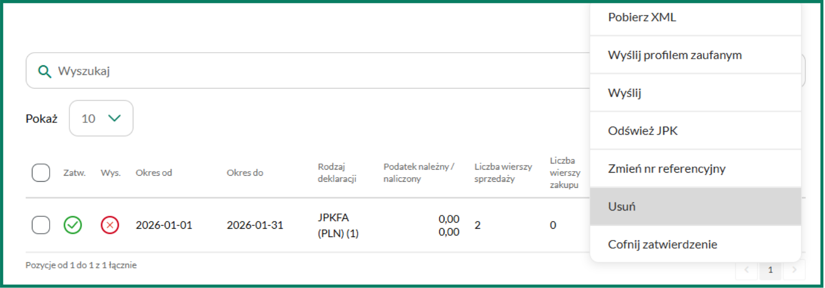 Na wygenerowanym pliku możesz wykonać takie akcje, jak: Pobierz xml, Wyślij, czy też Usuń.