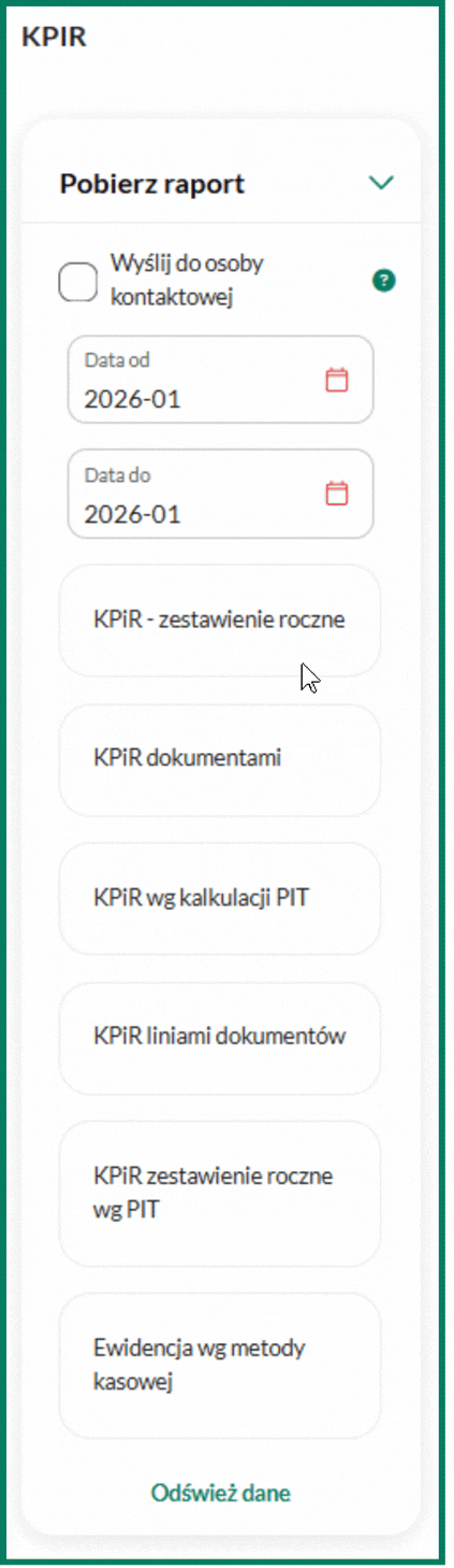 Dane do wydruku znajdziesz w raporcie rocznym KPiR. Aby wygenerować dokument, ustaw właściwą datę i wybierz opcję KPiR – zestawienie roczne: