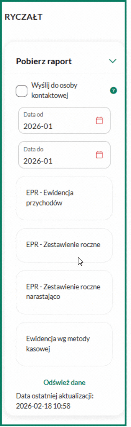 Podatnicy rozliczający się na zasadach ryczałtu mogą sprawdzić swój roczny przychód w rocznej ewidencji przychodu, dostępnej w zakładce Księgowość/Ryczałt. Aby wygenerować dokument, ustaw właściwą datę i wybierz opcję EPR – zestawienie roczne: