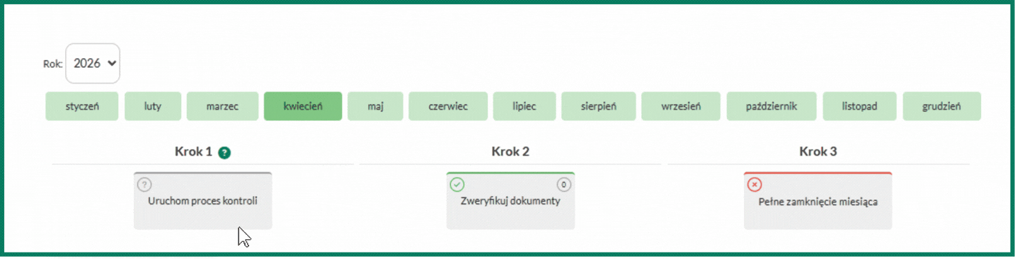 lub wygeneruj deklarację podczas procesu kontroli w zakładce Księgowość/Zamknij miesiąc, wybierając miesiąc kwiecień, a następnie przejdź do Kroku 2 - uruchom proces kontroli: