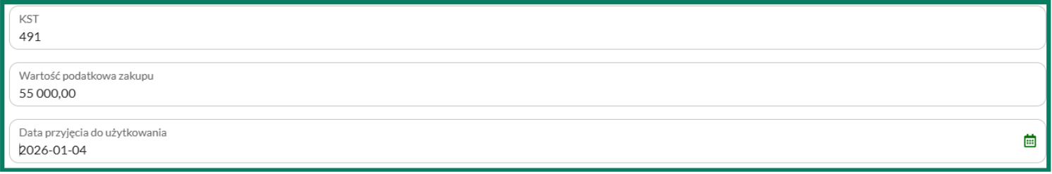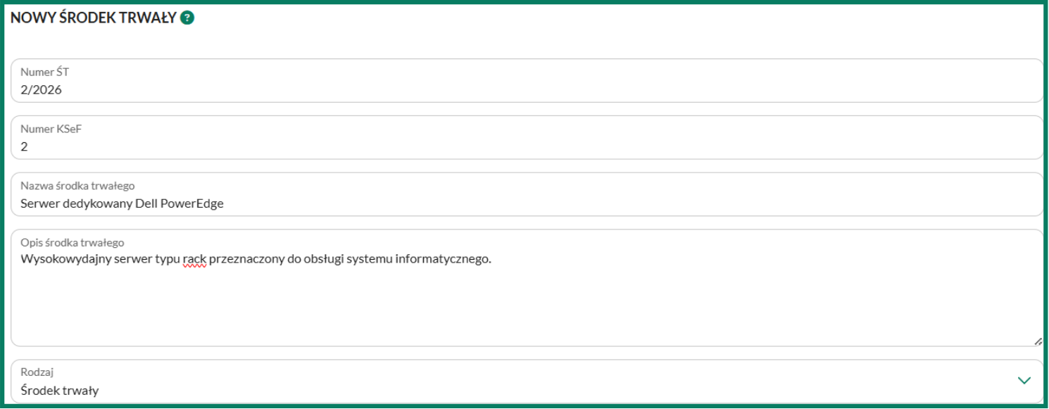 • KŚT - symbol Klasyfikacji Środków Trwałych, pole jest automatycznie wypełnione po wybraniu typu środka trwałego;