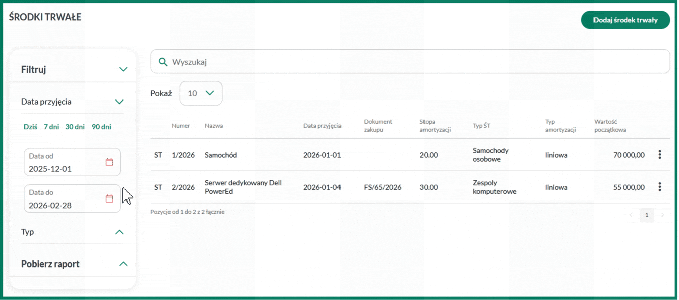 Jeśli nie widzisz środka trwałego na liście, sprawdź filtr Data przyjęcia po lewej stronie ekranu. Usuń zakres dat, aby wyświetlić wszystkie pozycje.