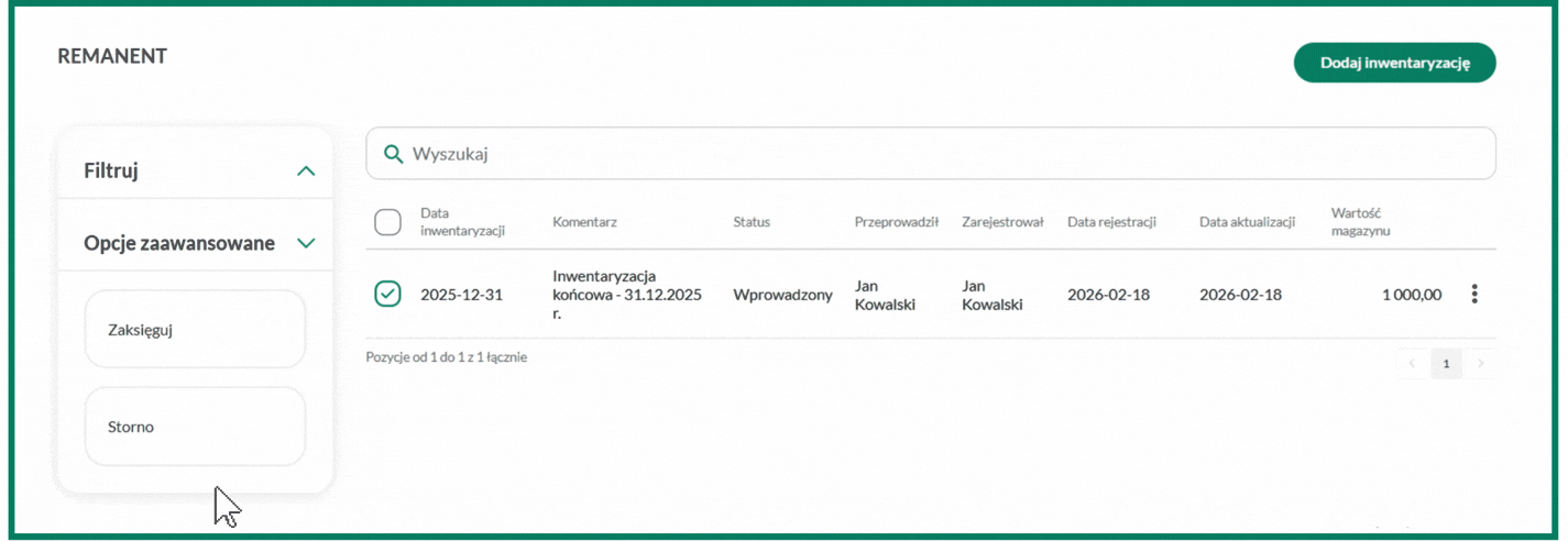 Edytowany remanent zobaczysz na liście z pozostałymi wpisami. Jeśli remanent został już zaksięgowany, nie możesz go edytować – ale masz możliwość jego wystornowania. W tym celu zaznacz wpis checkboxem, przejdź do Opcji zaawansowanych i wybierz przycisk Storno: