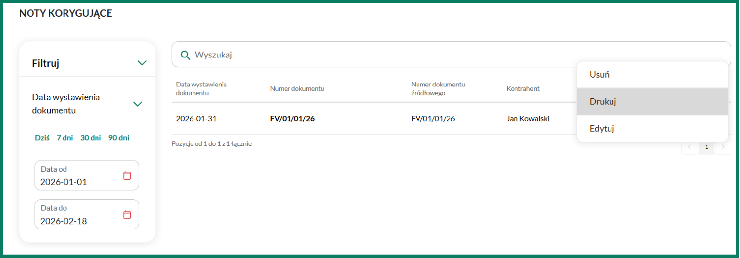 Z tego poziomu możesz również usunąć, wydrukować lub edytować wystawioną notę korygującą.
