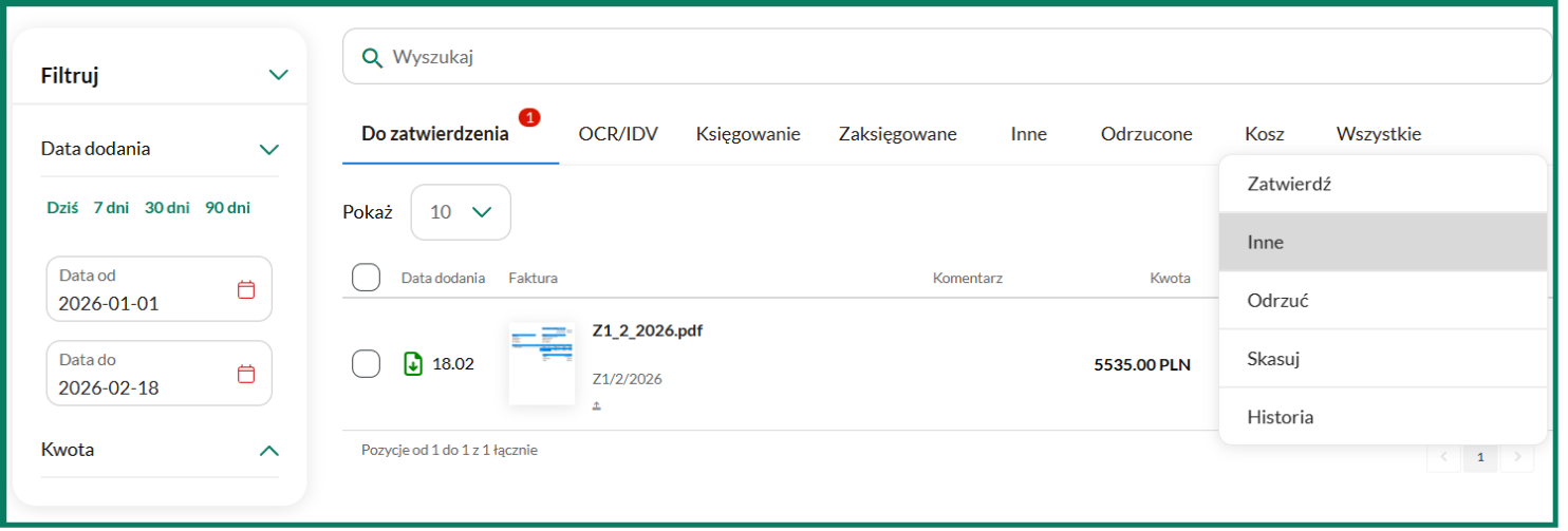 Aby zaakceptować skan jako fakturę, na dokumencie znajdującym się w folderze Do zatwierdzenia kliknij przycisk Zatwierdź.
