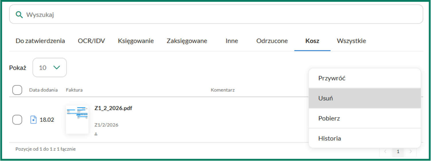 W celu usunięcia dokumentu z eSegregatora skieruj kursor myszy na dokument znajdujący się w zakładce Kosz, a następnie wybierz opcję Usuń.