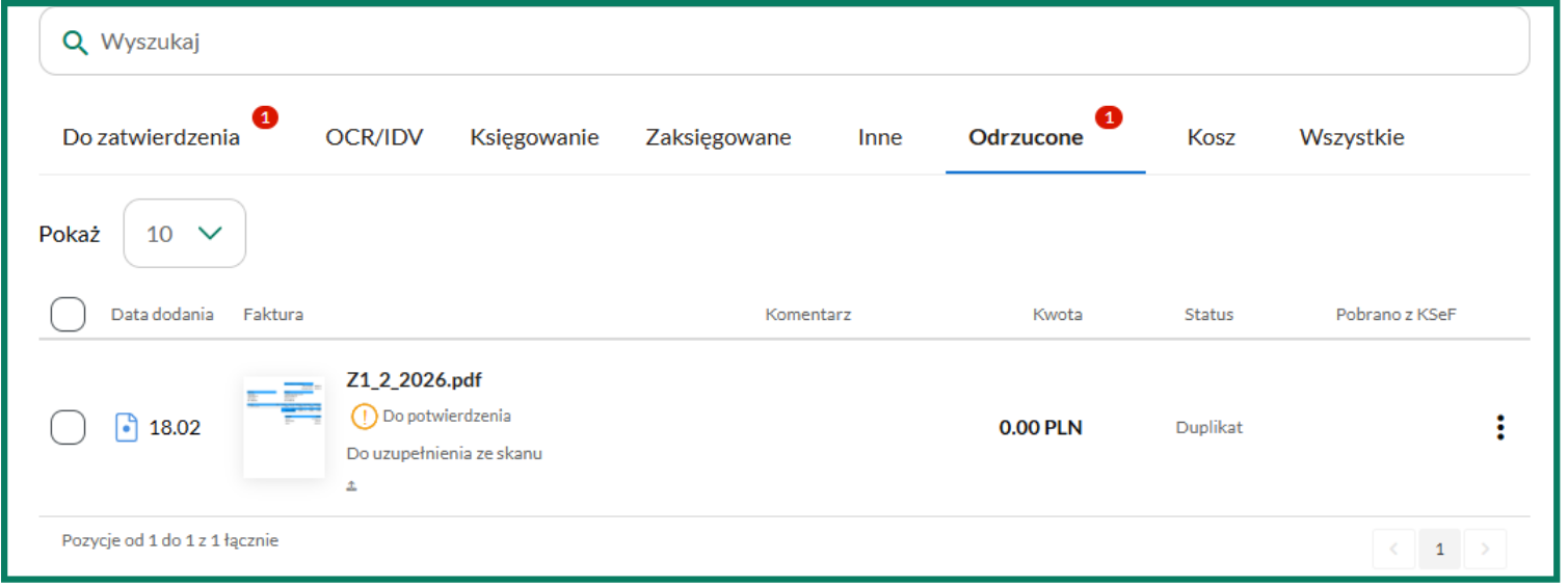 Potwierdź odrzucenie – wyświetlane jest dla dokumentów odrzuconych automatycznie przez system. Poza przyciskiem wyświetlany jest znak ! w kółeczku. Dokumenty, które są odrzucane z poziomu zakładki Do zatwierdzenia nie mają opcji Potwierdź odrzucenie i opcji Do potwierdzenia