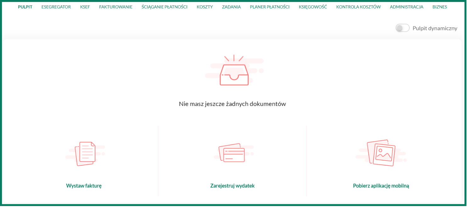 Po pierwszym zalogowaniu się do Systemu zostanie wyświetlona zakładka Pulpit. Pozwala ona na szybkie przejście do najważniejszych akcji. Stanowi to ułatwienie dla Użytkowników podczas pracy z programem.