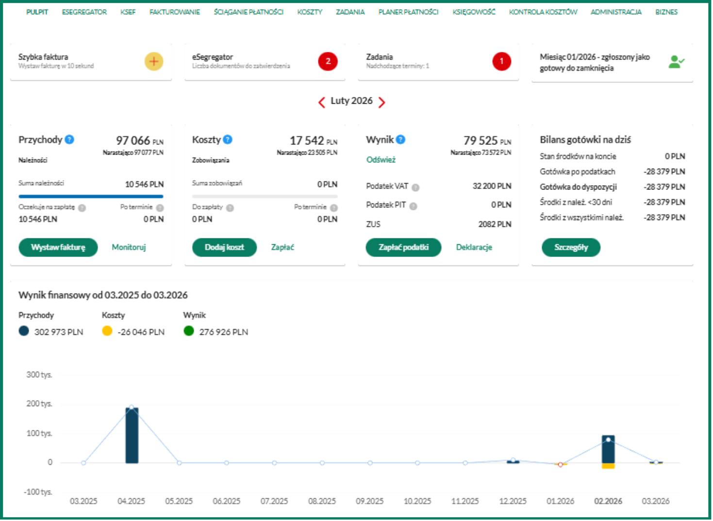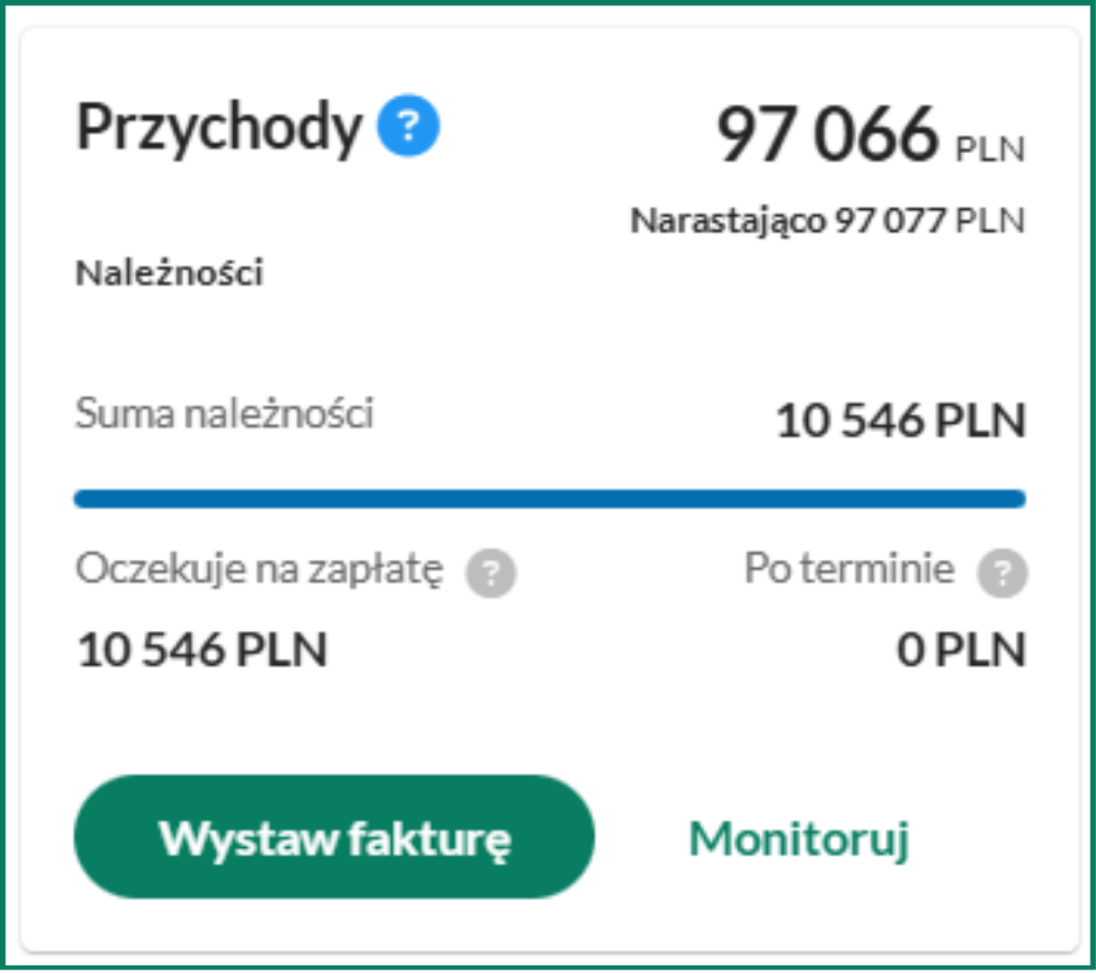 Z tego poziomu możesz przejść do szablonu faktury sprzedaży poprzez wybranie przycisku Wystaw fakturę. Wykazane są tu kwoty przychodów z działalności w miesiącu i narastająco od początku roku, kwoty wynikające z niezapłaconych faktur sprzedaży, ale jeszcze przed terminem płatności oraz kwoty wynikające z niezapłaconych faktur sprzedaży już po terminie płatności.