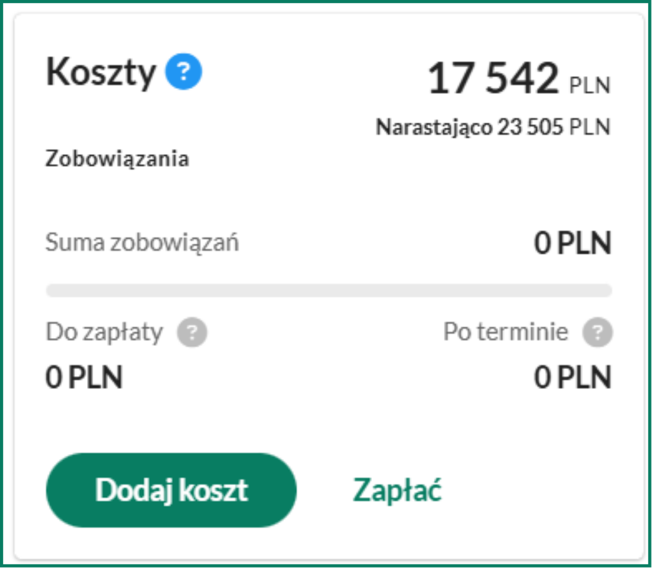 Z tego poziomu możesz bezpośrednio przejść do zakładki Koszty/Faktury kosztowe, aby dodać fakturę kosztową.