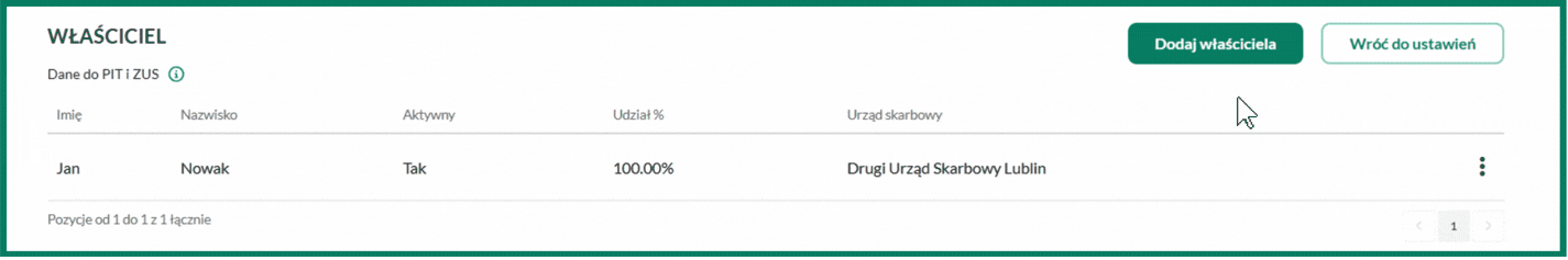 Dodany wspólnik pojawi się na liście w zakładce Ustawienia/Właściciel.