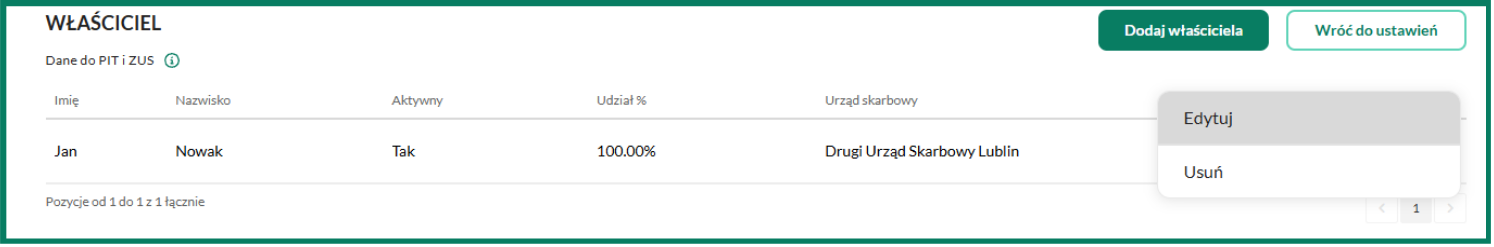 Dane właściciela lub wspólnika możesz w każdej chwili edytować. Przejdź do zakładki Ustawienia/Właściciel, skieruj kursor myszy na pole udziału i kliknij przycisk Edytuj.